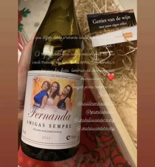 Deze gepersonaliseerde wijnfles voor een Braziliaanse vriendin is op onze website besteld, in Oentsjerk afgehaald en uiteindelijk op de...