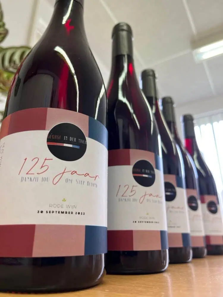 Hoe vind je dit prachtige 125 jaar jubileumrelatiegeschenk met persoonlijk etiket voor George in der Mauer. De klant heeft het wijnetiket zelf ontworpen! Complimenten hoor. Proost op jullie 125 jaar.